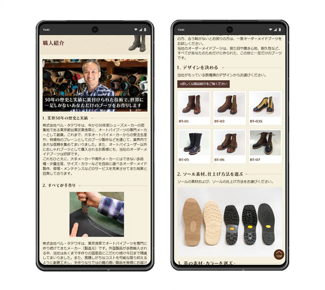 ブーツ作りに向き合う職人の想い、1足ずつ丁寧に仕上げるオーダーメイドならではの履き心地、細部まで行き届いたデザインへのこだわりなど、オーダーメイドブーツを探すお客様に向けたメッセージを、ホームページを通して丁寧に伝えています。